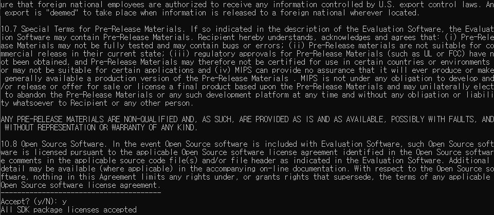 아래와 같이 "All SDK package licenses accepted"라고 뜨면 완료된 것이다.