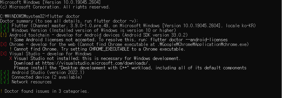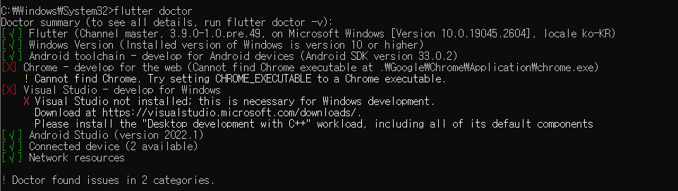 아래와 같이 플러터 설치 중에 문제가 생겼다.