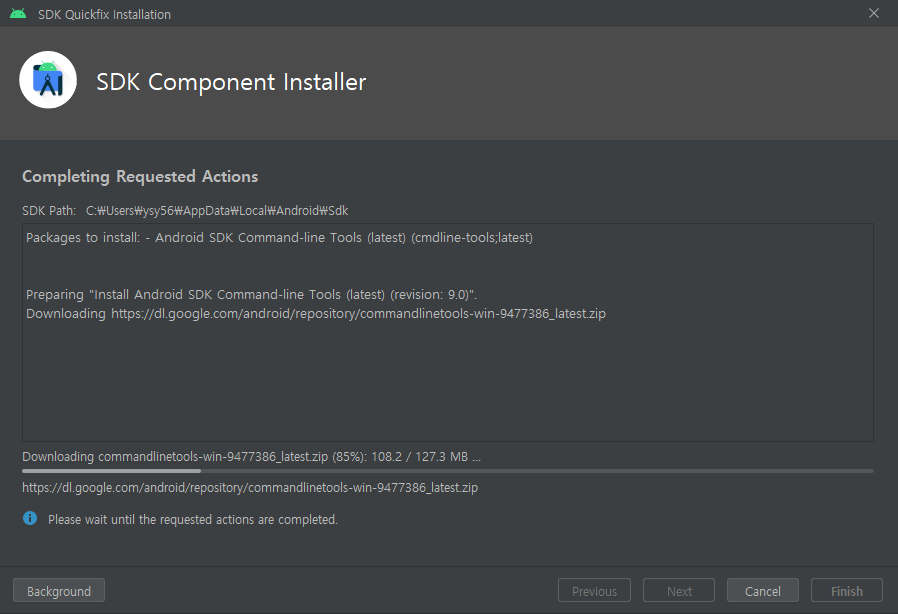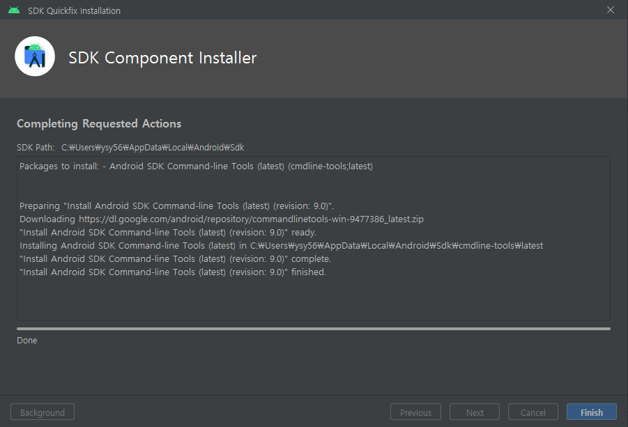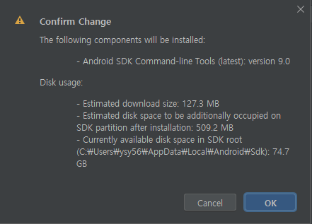 아래와 같이 "cmdline-tools component is missing"에 대한 문구가 사라진 것을 확인할 수 있다.