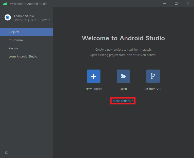 빨간색으로 표시된 More Actions에서 SDK Manager을 클릭한다.