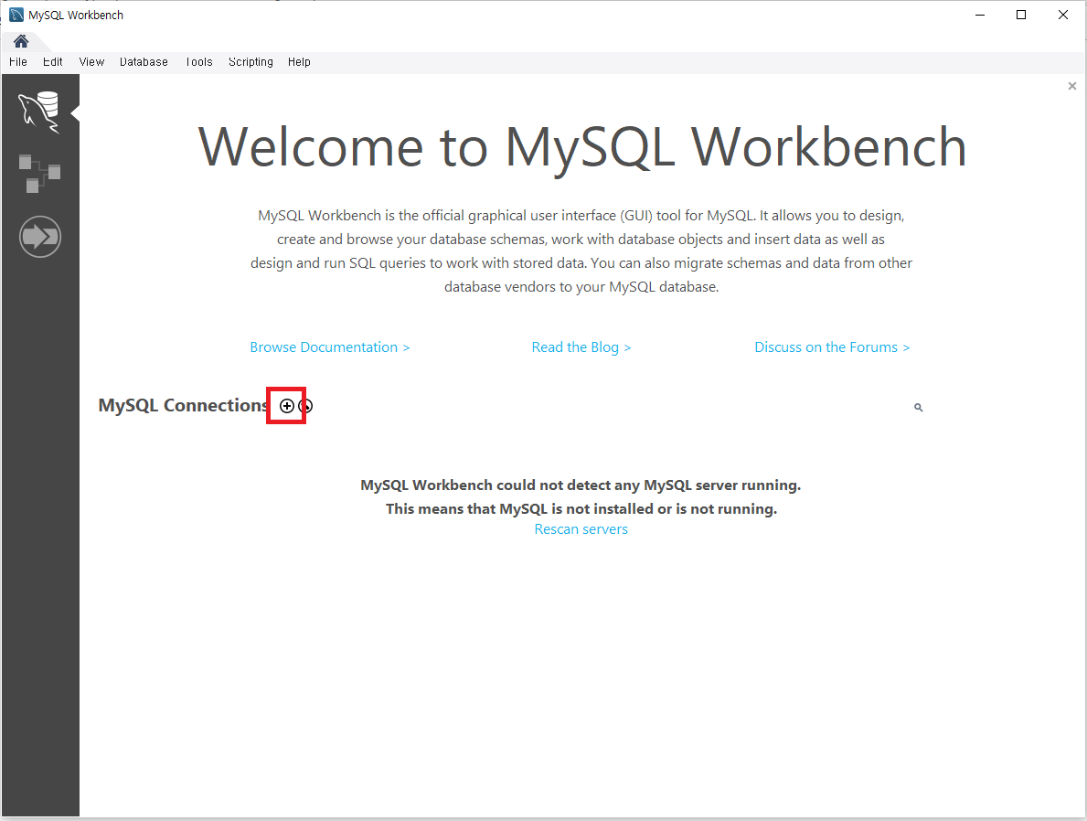 중간의 MySQL Connections 옆의 빨간색으로 표시된 "+" 기호를 클릭한다.