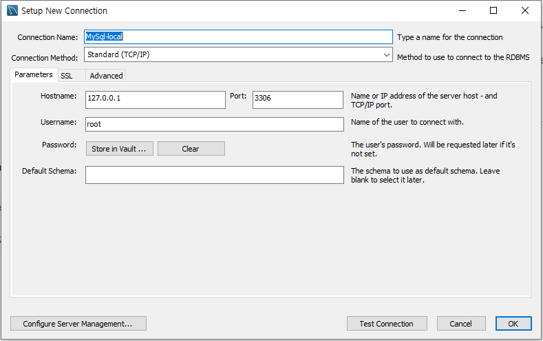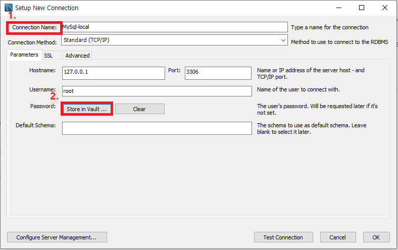 Connection Name을 "MySql-local"로 작성해준 후 "Store in Vault ..." 을 클릭한다.