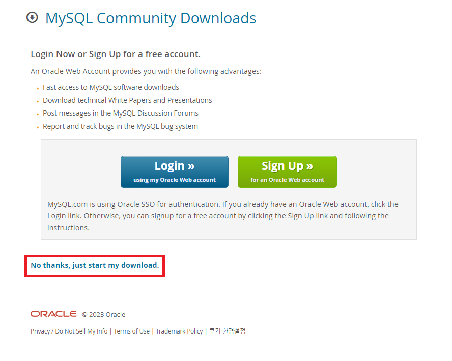 빨간색으로 표시된 "No thanks, just start my download."를 클릭하면 파일(mysql-workbench-community-8.0.23-winx64.msi)이 다운로드 받아진다.