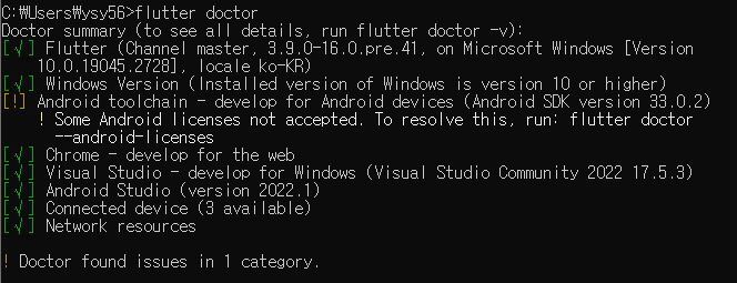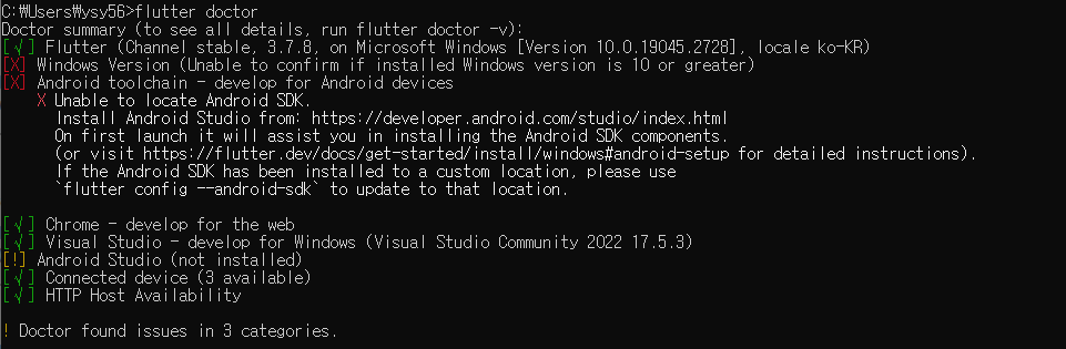 ** flutter config --android-sdk "C:\Users\ysy56\AppData\Local\Android\Sdk"