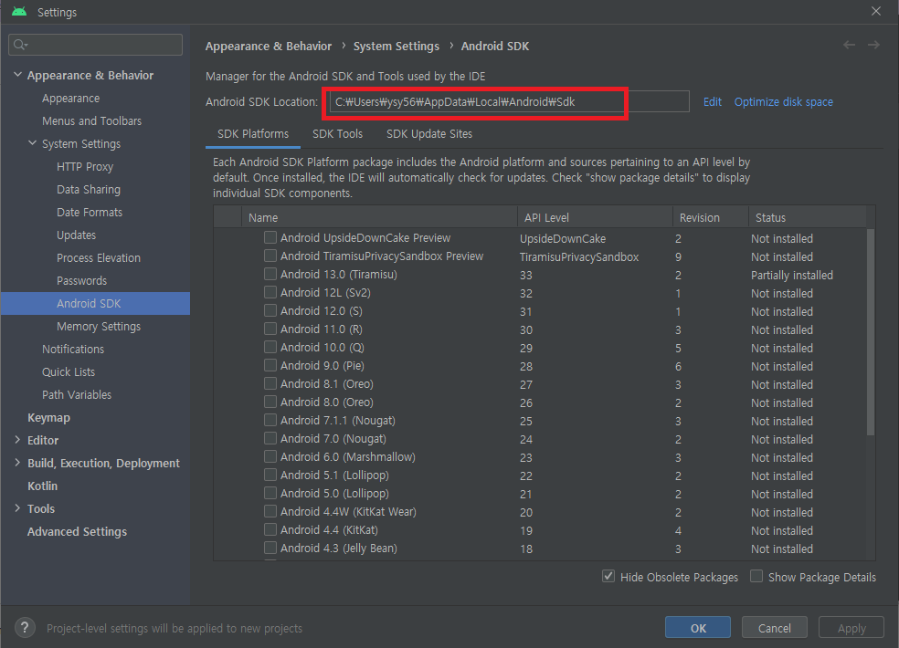 빨간색으로 표시된 Android SDK Location을 복사한다.